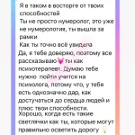 Я в таком в восторге от твоих способностей. Ты не просто нумеролог, это уже не нумерология, ты вышла за рамки. Как ты точно всё увидела. Да, я тебе доверяю, поэтому все рассказываю ты как психотерапевт. Думаю тебе нужно пойти учится на психолога, потому что, у тебя есть однозначно дар, как достучаться до сердца людей и плюс твои способности. Хорошо, когда есть такие светлячки как ты, которые могут правильно осветить дорогу.
