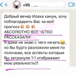 Добрый вечер Илаха ханум, хочу поблагодарить Вас за мой прогноз. АБСОЛЮТНО ВСЕ ЧЕТКО РАССКАЗАЛИ! Я даже не знаю отчего начать :), но Вы будто разложили меня по полочкам, все аспекты которые Вы затронули 1:1 отображают мою реальность!!!