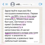 Здравствуйте еще раз) Все послушала внимательно. Первая часть, на 99% точь-в-точь меня описали. Моментами даже был шок, настолько в точку прям!! Особенно про импульсивность и непостоянство. И насчет аналитического склада ума тоже верно- я аналитик по профессии, и довольно таки любопытный человек.
